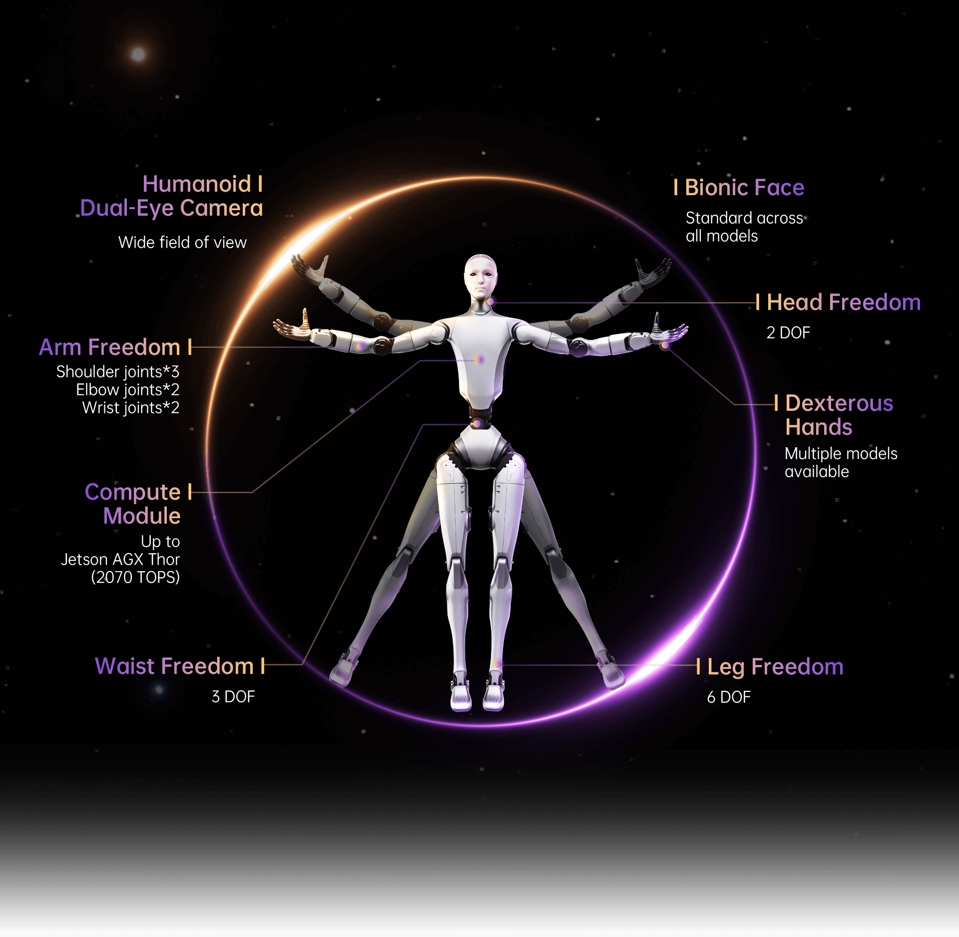 - Menschlicher Realismus: Im Gegensatz zu den eher technischen Skelett-Designs früherer Modelle (wie dem H1) verfügt der H2 über ein ästhetisches Gehäuse und ein bionisches Gesicht, was ihn für die Interaktion mit Menschen nahbarer macht.